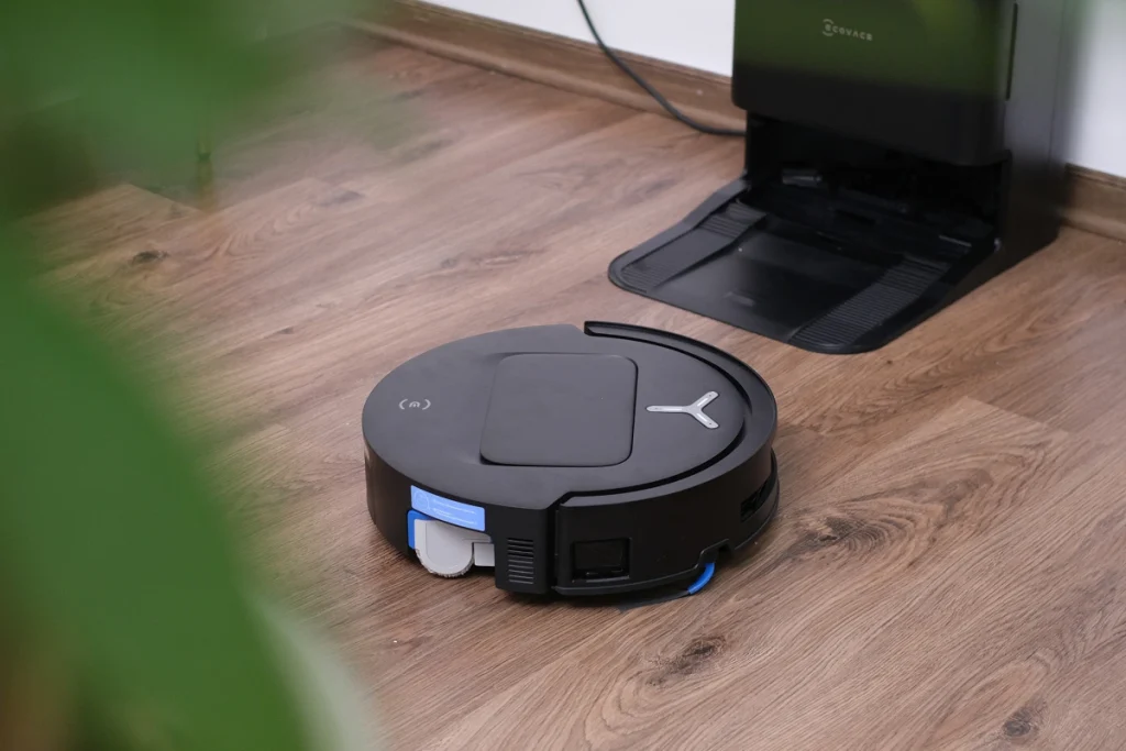 Thay vì có nắp che toàn bộ mặt trên như X8, T80 chỉ có nắp nhỏ che phần hộc đựng rác, các nút bấm bật, tắt. Phần nhựa nhám cho cảm giác không cao cấp bằng X8. Ecovacs cũng dần đưa công nghệ Lidar ẩn ở cạnh bên thân trở thành trang bị tiêu chuẩn cho dòng T, khiến phần lồi bên trên biến mất, robot mỏng hơn giúp chui vào được gầm ghế, giường. Các hãng khác như Dreame, Roborock hiện thử nghiệm cả cảm biến Lidar thò thụt, chỉ hạ xuống khi gặp vật cản để tối ưu độ mỏng.