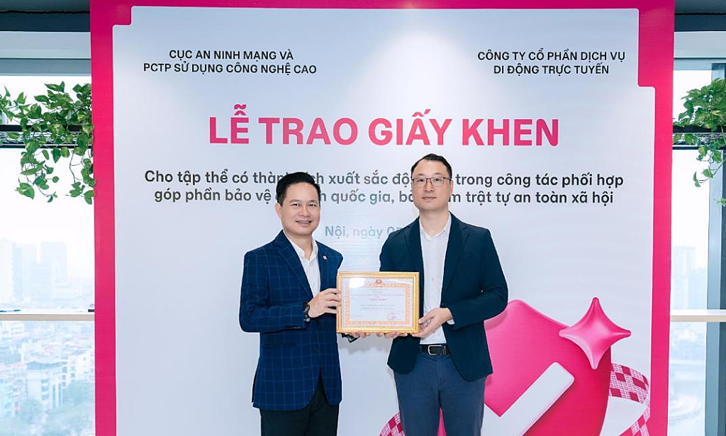 Đại diện doanh nghiệp nhận giấy khen từ Cục An ninh mạng và phòng chống tội phạm sử dụng công nghệ cao ngày 5/3. Ảnh: MoMo