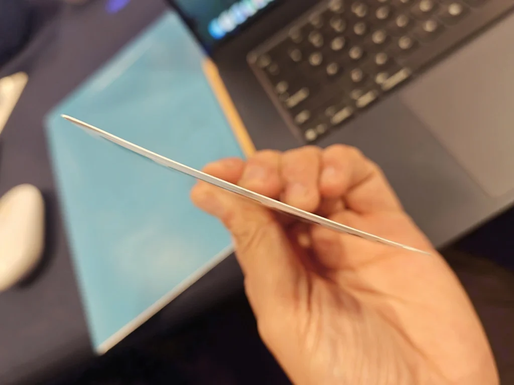Hình ảnh viên pin được cho là chụp tại một cuộc họp nội bộ công ty hoặc buổi giới thiệu cho đại lý tại thị trường Việt Nam đầu tuần này. Điểm ấn tượng là kích thước pin rất mỏng, tương đương thẻ ATM. Kích thước tổng thể của pin tương đương với một lá bài và thông số dung lượng là 3.000 mAh.