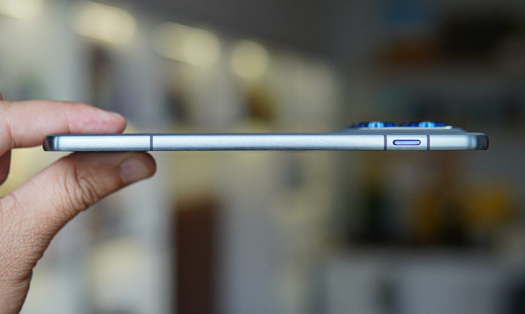 Hệ thống phím vật lý bao gồm nút nguồn và cụm tăng giảm âm lượng được đặt tập trung ở cạnh phải. Các nút bấm này có thiết kế mảnh, hành trình phím ngắn, dù vậy vẫn đảm bảo độ nảy và phản hồi xúc giác rõ ràng, không gây hiện tượng lỏng lẻo dù kích thước khung máy bị giới hạn. Tuy nhiên việc bố trí các dải ăng-ten với màu đậm khiến thân máy có cảm giác bị chia làm nhiều phần, giảm yếu tố thẩm mỹ.